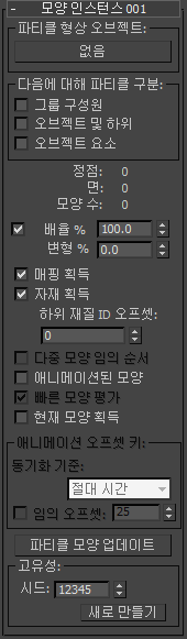 이 컨트롤을 사용하여 파티클 형상으로 사용할 오브젝트를 정의합니다. 이 오브젝트를 참조 오브젝트라고 합니다.
