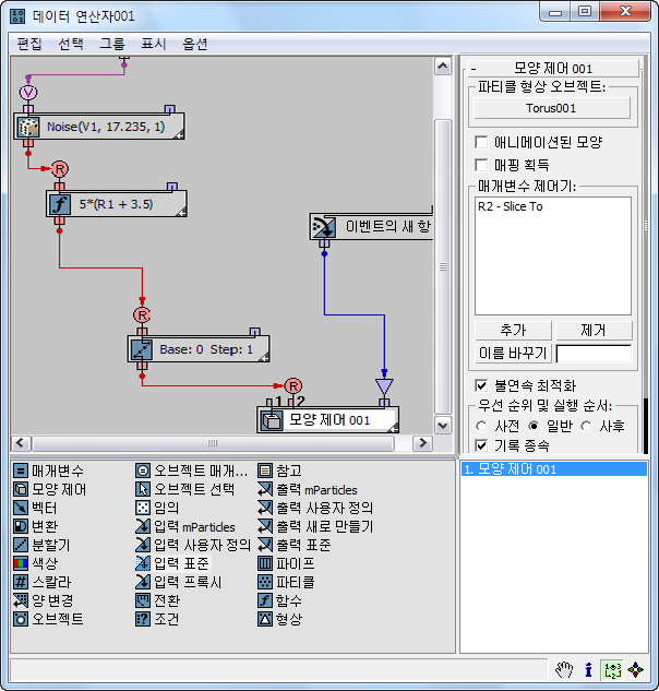 데이터 뷰는 파티클 흐름에서 고급 데이터 조작 도구의 명령 센터 역할을 합니다. 데이터 뷰의 기본 작업은 파티클 뷰와 유사합니다. 대화상자의 맨 아래에 있는 기지에서 하위 연산자를 주 창으로 드래그하여 데이터 흐름 구성을 시작합니다. 하위 연산자의 매개변수에 액세스하려면 해당 매개변수를 클릭하여 롤아웃을 대화상자 오른쪽에 표시합니다. 하위 연산자를 연결하여 한 하위 연산자의 출력 커넥터와 다른 하위 연산자의 입력 커넥터 또는 필터 커넥터 사이를 드래그하는 방식으로 실제 흐름이나 도식을 작성합니다.