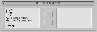 렌즈 효과 시스템에서는 왼쪽 리스트에서 특정 효과를 선택하고 오른쪽 리스트에 추가하여 렌더링된 이미지에 효과를 적용할 수 있습니다. 각 효과마다 매개변수 롤아웃이 있지만 모든 효과는 두 개의 전역 매개변수 패널을 공유합니다.