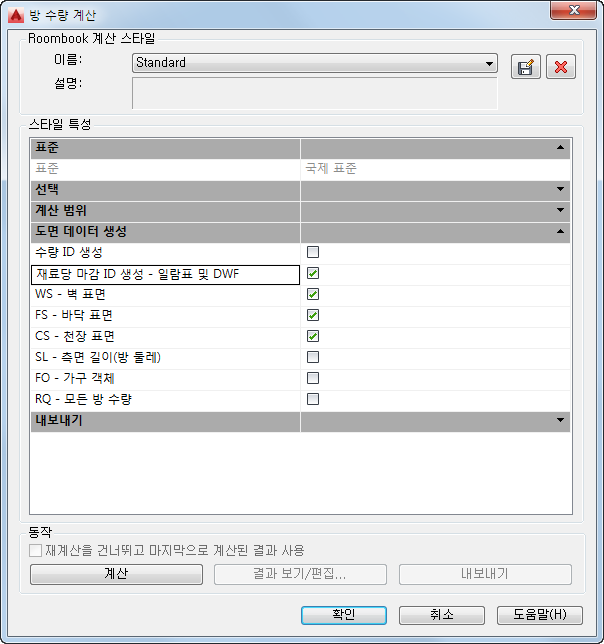 - 방 수량 계산 대화상자의 스타일 특성 아래, 도면 데이터 생성 리스트에서 재료당 마감 ID 생성을 선택합니다.