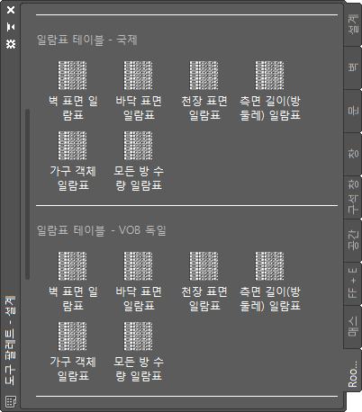 이 도구 팔레트 Roombook에는 현재 계산 표준에 따라 다양한 일람표 테이블이 포함됩니다. 이 명령은 Roombook Styles.dwg 파일에 링크됩니다.