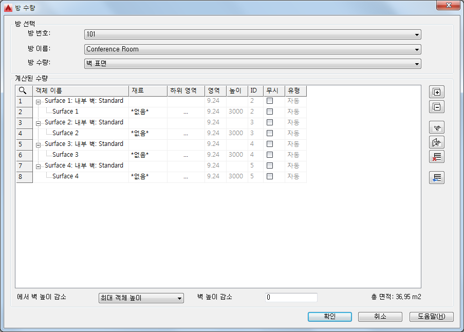 - 방 수량 대화상자의 방 선택 아래, 방 수량 리스트에서 벽 표면을 선택합니다.