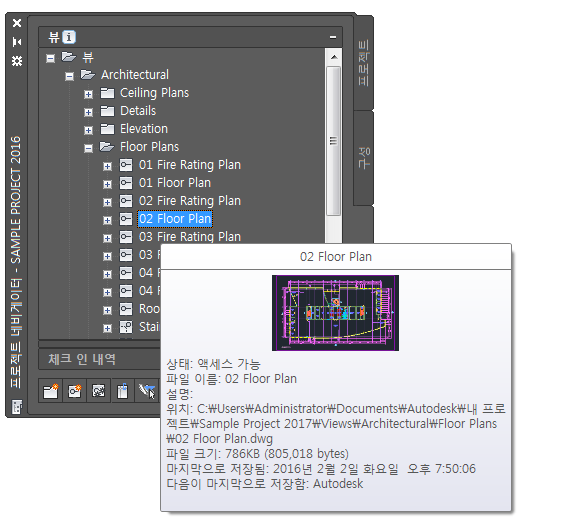 커서를 도면 탐색기의 항목 위로 이동할 때 표시되는 툴팁의 컨텐츠를 지정하려면 도구막대에서 비어 있는 영역을 마우스 오른쪽 버튼으로 클릭하고 다음 옵션 중 하나를 선택합니다.