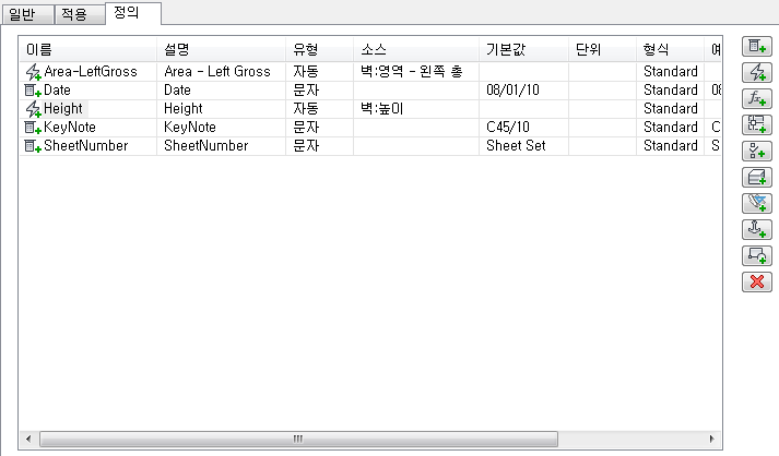 날짜/시간, 문서, 하이퍼링크, 객체, 시스템 변수, 디젤 표현식 또는 플롯 필드 | AutoCAD 도움말의 "문자에 필드 사용"을 참고하십시오. |