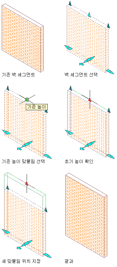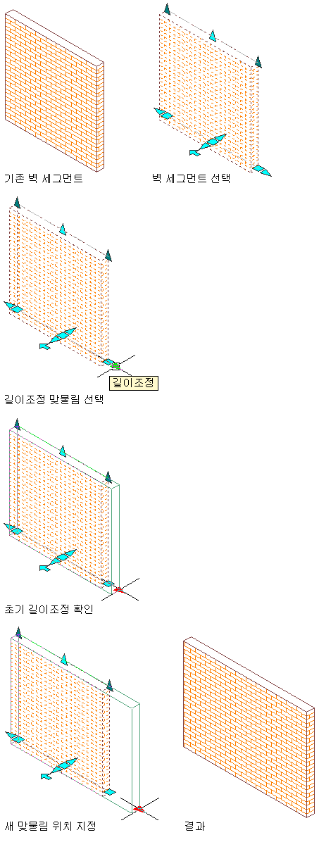 자리맞추기는 벽이 그려진 방향과 벽을 그리기 위해 사용한 점에 대하여 벽의 위치를 결정합니다. 기존 벽의 자리맞추기 변경은 벽을 이동시키고 벽이 다른 벽들과 마무리되는 방식에 영향을 미칠 수 있습니다. 특성 팔레트에서 자리맞추기를 변경할 수도 있습니다.
