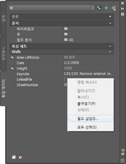 날짜/시간, 문서, 하이퍼링크, 객체, 시스템 변수, 디젤 표현식 또는 플롯 필드 삽입 | AutoCAD 도움말의 "문자에 필드 사용"을 참고하십시오. |