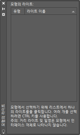 유형 열의 아이콘은 라이트의 유형(포인트 라이트, 스폿라이트, 거리 라이트) 및 라이트의 켜짐/꺼짐을 나타냅니다. 리스트에서 라이트를 선택하여 도면의 라이트를 선택합니다. 리스트를 정렬하려면 열 헤더에서 유형 또는 이름을 클릭합니다.
