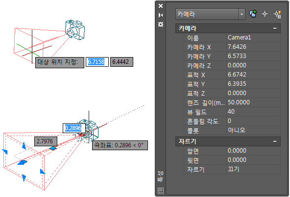 카메라의 렌즈 길이를 수정하고 앞면 및 뒷면 자르기 평면을 변경하며 카메라 이름을 지정하고 도면에서 모든 카메라의 표시를 켜거나 끌 수 있습니다.