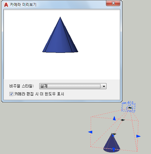 카메라를 선택하면 카메라 미리보기 대화상자가 열리며 카메라의 뷰가 표시됩니다.