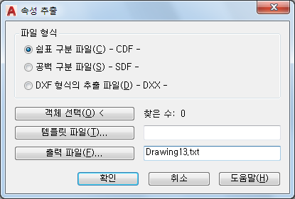 추출된 속성 데이터에 대한 파일 이름 및 위치를 지정합니다. 추출된 속성 데이터에 대한 경로 및 파일 이름을 입력하거나 출력 파일을 선택한 다음 표준 파일 선택 대화상자를 사용하여 기존의 템플릿 파일을 검색할 수 있습니다. .txt 파일 확장자가 CDF 또는 SDF 파일에 사용되고 DXF 파일에는 .dxx 파일 확장자가 사용됩니다.