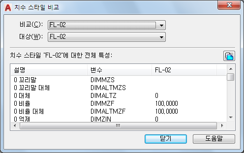치수 스타일 비교 결과를 표시합니다. 서로 다른 두 스타일을 비교하면 각기 다른 특성이 표시됩니다. 두 번째 스타일을 <없음> 또는 첫 번째 스타일과 동일한 스타일로 설정하면 치수 스타일의 모든 특성이 표시됩니다.