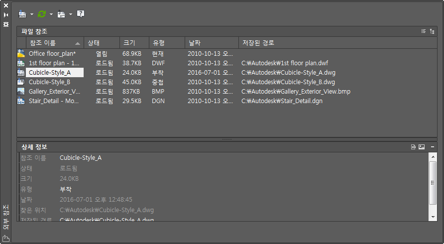 외부 참조 팔레트는 DWG 파일(xrefs), DWF, DWFx, PDF 또는 DGN 언더레이, 래스터 이미지, 점 구름(RCP 및 RCS 파일) 및 조정 모형(NWD 및 NWC 파일)과 같은 참조된 파일을 구성하고, 표시하고, 관리합니다.