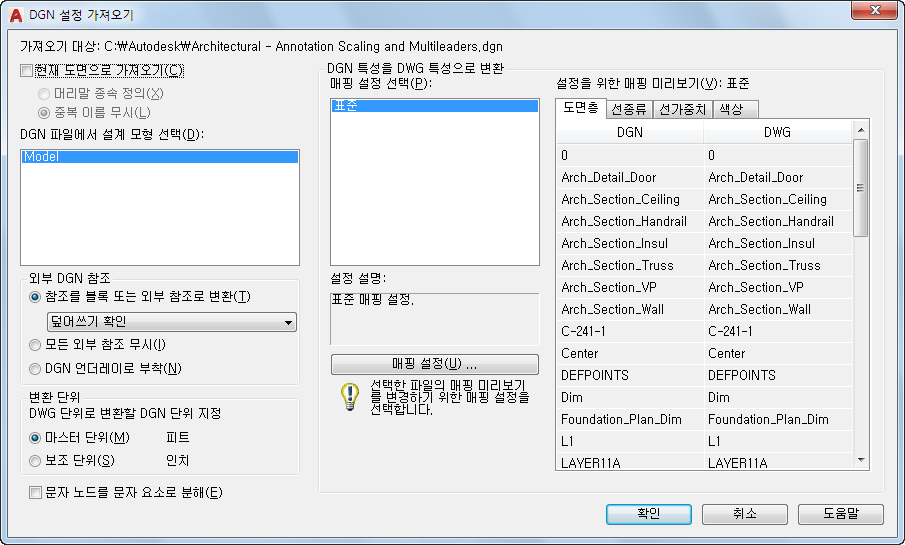 표준은 내보낼 도면에서 데이터를 추출하고, 매핑 미리보기에 표시된 대로 DGN 도면층, 선종류, 선가중치, 색상에 자동 매핑을 적용하는 기본 매핑 설정입니다.