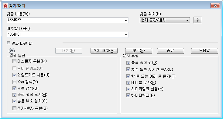 예를 들어, 도면에 여러 유사한 부품이 있지만 모두 4384K61로 변경해야 할 경우 찾을 내용 상자에 4384K6?를 입력하고 대치할 내용 상자에 4384K61을 입력합니다.
