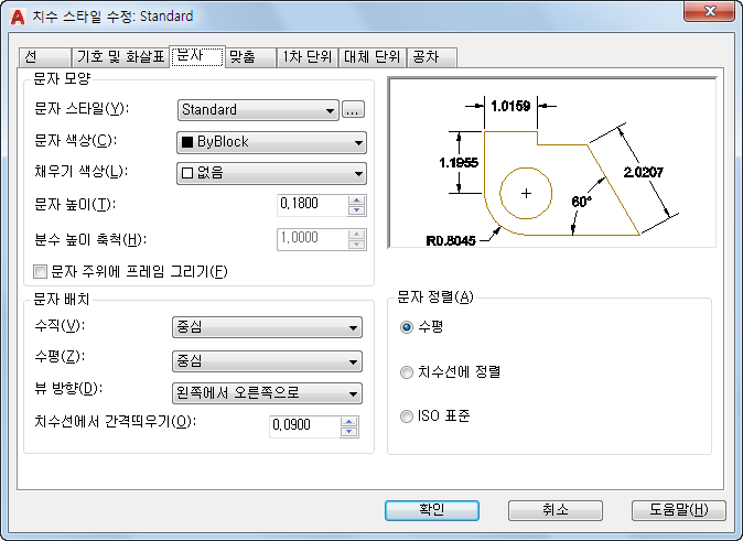 치수 문자의 형식, 배치 및 정렬을 설정합니다.