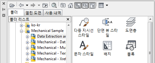 폴더, 도면 열기, 사용 내역 탭을 통해 여러 가지 방법으로 컨텐츠에 액세스할 수 있습니다.