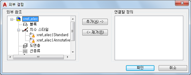 외부 참조 리스트에서 선택한 명명된 객체 정의를 연결할 정의 리스트로 이동합니다.