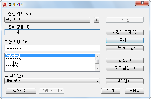 한 줄 문자, 여러 줄 문자, 다중 지시선 문자, 블록 속성의 문자, 외부 참조의 문자 및 치수에 추가된 문자 등에서 철자를 검사합니다.