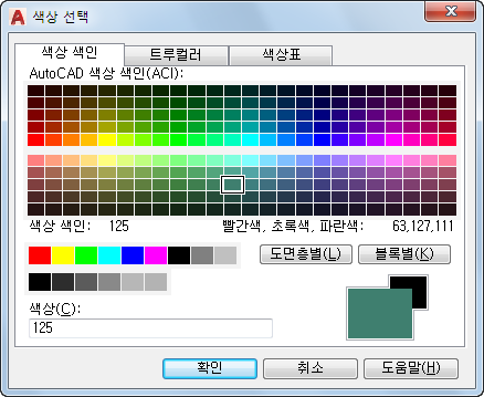 AutoCAD 색상 색인(ACI)에서 세 개의 탭에 있는 255개의 색상, 트루컬러, 색상표 중에서 선택할 수 있습니다.