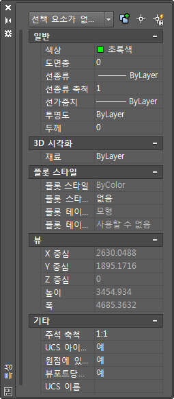 객체가 선택되지 않은 경우 위에 강조된 드롭다운 리스트에 도면의 현재 설정이 표시됩니다. 객체를 선택하면 드롭다운 리스트에 해당 객체에 대한 특성 설정이 표시됩니다.