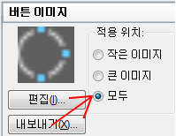 버튼 이미지 창의 적용 위치 아래에서 작은 이미지, 큰 이미지 또는 모두 중 원하는 이미지 지정 옵션을 선택합니다. 그런 다음 이미지 리스트에서 가져온 이미지를 선택합니다.