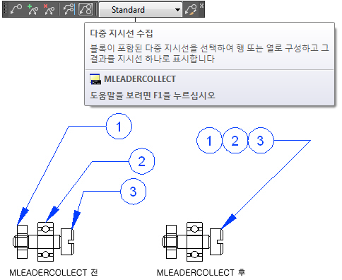 블록을 컨텐츠로 포함하는 다중 지시선 객체를 수집해서 하나의 연결선에 부착할 수 있습니다. MLEADERCOLLECT를 사용하여 도면에서 필요한 대로 다중 지시선을 수평이나 수직으로 또는 지정한 영역 내에서 수집할 수 있습니다.