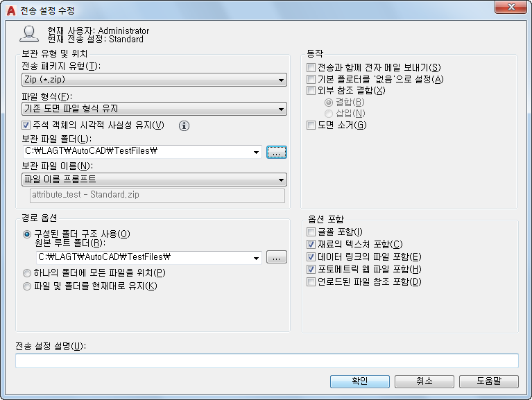 이 필드를 변경하지 않고 그대로 둘 경우, 전송 파일은 첫 번째 지정된 도면 파일이 들어 있는 폴더에 작성됩니다. 시트 세트 환경에서 전송 파일은 시트 세트 데이터(DST) 파일이 들어 있는 폴더에 작성됩니다. AutoCAD LT에는 해당되지 않습니다.