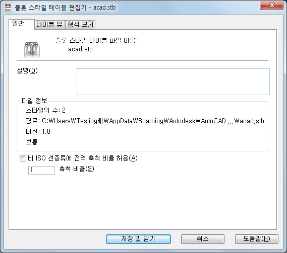 편집하고 있는 플롯 스타일 테이블에 관한 정보 즉, 플롯 스타일의 수, 경로 및 플롯 스타일 테이블 편집기의 버전 번호를 표시합니다.