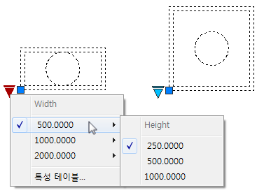 역순 찾기가 설정된 찾기 특성은 동적 블록 참조에 찾기 그립을 추가합니다. 이 그립을 클릭하면 해당 열의 찾기 값 드롭다운 리스트가 표시됩니다. 선택한 리스트 항목의 해당 입력 특성 값은 블록 참조에 지정됩니다.