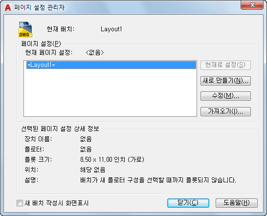 또한 명명된 페이지 설정을 작성하거나 기존 페이지 설정을 수정하거나 또는 다른 도면에서 페이지 설정을 가져올 수 있습니다.
