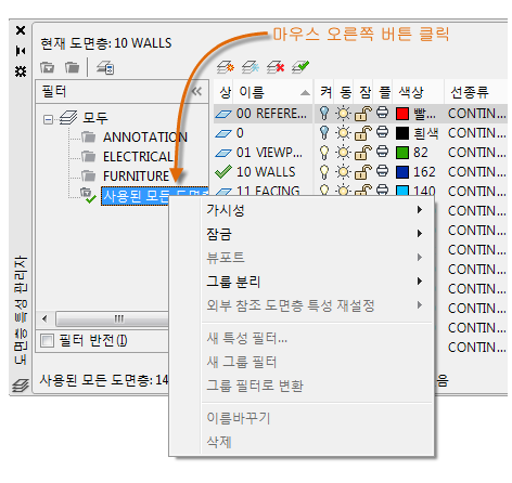 선택한 도면층 필터를 제거합니다. 모든 도면층, 사용된 모든 도면층 또는 외부 참조 도면층 필터는 삭제할 수 없습니다.