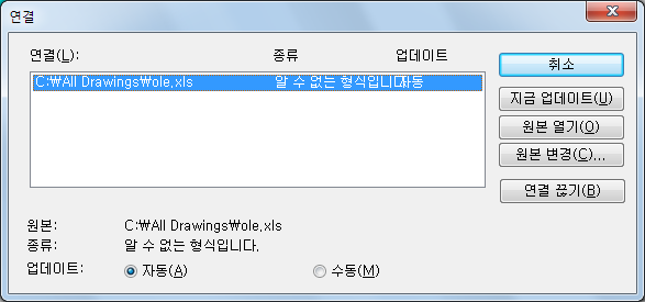 객체와 원본 파일 사이의 연결을 끊습니다. 도면의 객체가 WMF(Windows 메타파일 형식)로 변경되며 이 메타파일은 원본 파일이 이후에 변경되더라도 영향을 받지 않습니다.