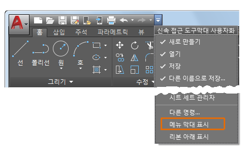 메뉴 막대는 빠른 액세스 도구 모음 드롭다운에서 사용할 수 있거나 CUI로 사용자 인터페이스를 사용자화하여 사용할 수 있습니다.