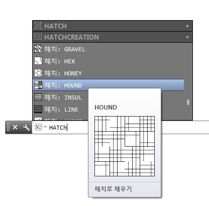 해치 이름을 선택하고 도면의 닫힌 영역 또는 객체 내부를 클릭하여 삽입합니다.