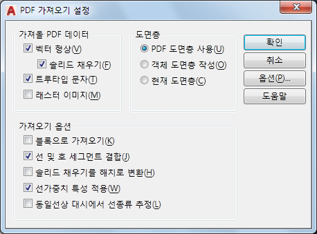 지정한 PDF 파일에서 형상, 채우기, 래스터 이미지 및 트루타입 문자 객체를 가져오기 위한 옵션을 설정합니다.