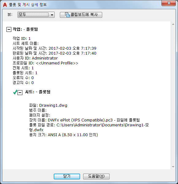 완료된 모든 플롯 및 게시 작업과 이러한 작업 내의 시트에 대한 정보를 표시합니다.