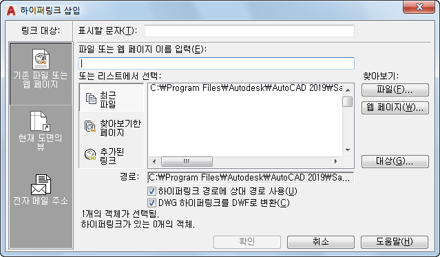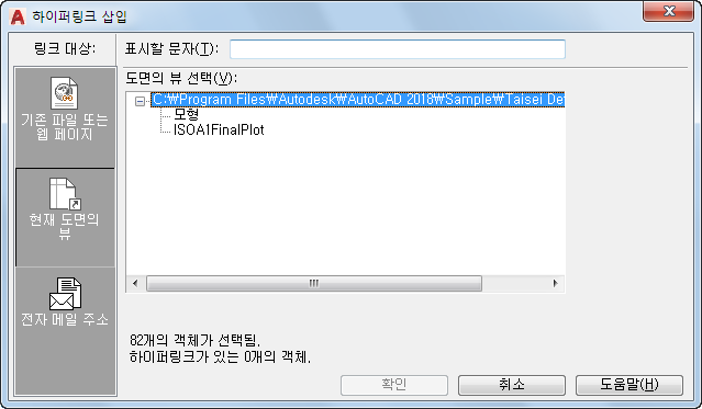 현재 도면의 뷰 탭(하이퍼링크 삽입 대화상자)