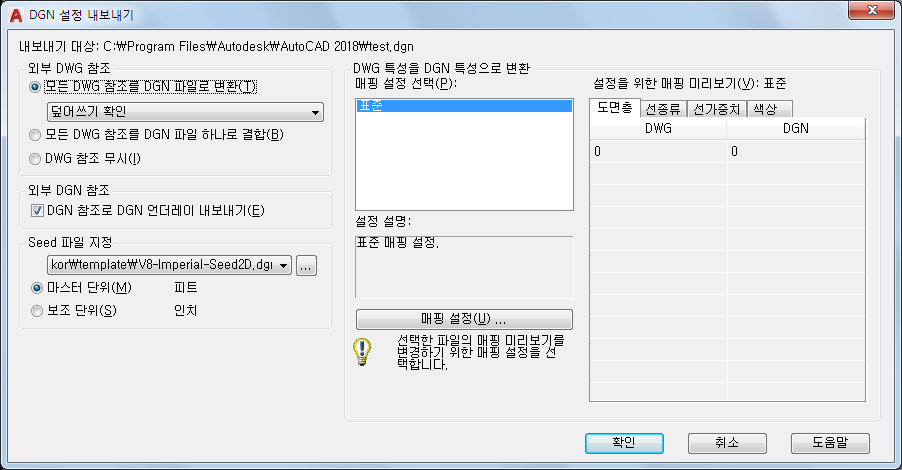 표준은 내보낼 도면에서 데이터를 추출하고, 매핑 미리보기에 표시된 대로 DGN 도면층, 선종류, 선가중치, 색상에 자동 매핑을 적용하는 기본 매핑 설정입니다.