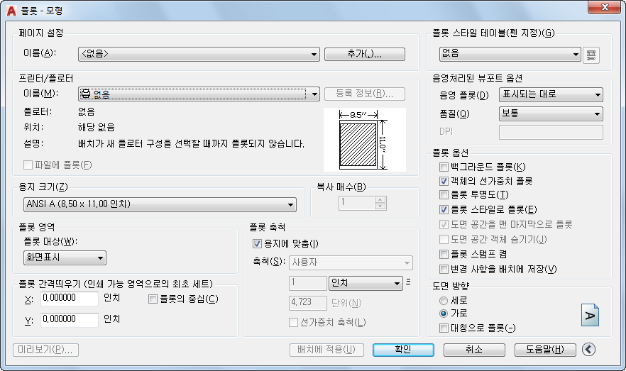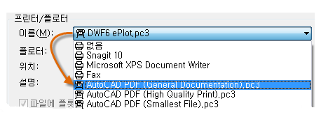 프린터/플로터 드롭다운 리스트에서 AutoCAD PDF(일반 문서).pc3을 선택합니다.