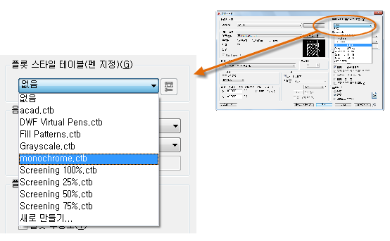플롯 스타일 테이블은 색상 처리에 대한 정보를 제공합니다. 모니터에는 적절하게 표시된 색상이 PDF 파일이나 인쇄에는 적합하지 않을 수 있습니다. 예를 들면 도면은 컬러로 작성하지만 출력은 흑백으로 작성하려고 할 수 있습니다. 다음은 단색 출력을 지정하는 방법입니다.