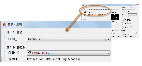 플롯할 준비가 되면 플롯 대화상자에서 페이지 설정 이름을 지정하기만 하면 됩니다. 그러면 모든 플롯 설정이 복원됩니다. 다음 그림에서는 플롯 대화상자가 히치하이커 페이지 설정을 사용하도록 설정되어 있습니다. 이 페이지 설정은 플로터에 인쇄하는 대신 DWF(Design Web Format) 파일을 출력합니다.