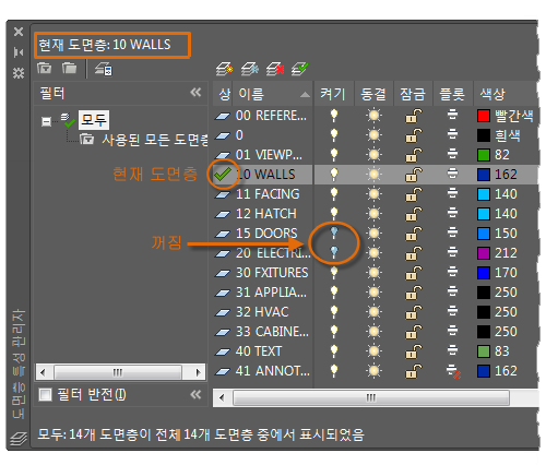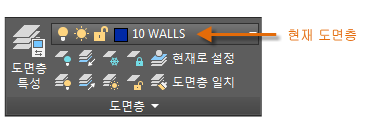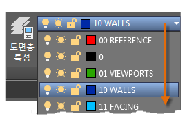 그림에서 볼 수 있듯이 도면층 10 WALLS가 현재 도면층입니다. 모든 새 객체는 해당 도면층에 자동으로 배치됩니다. 도면층 리스트에서 도면층 10 WALLS 옆에 있는 초록색 확인 표시는 이 도면층이 현재 도면층임을 나타냅니다.
