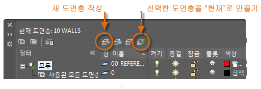 새 도면층을 작성하려면 표시된 버튼을 클릭하고 새 도면층의 이름을 입력합니다. 다른 도면층을 현재 도면층으로 만들려면 도면층을 클릭한 다음 표시된 버튼을 클릭합니다.