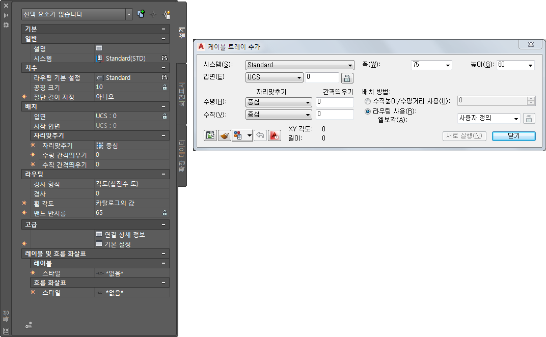 | 지정된 각도로만 그리기 | 엘보각(케이블 트레이) 또는 휨 각도(전선관) 옆에 있는 |