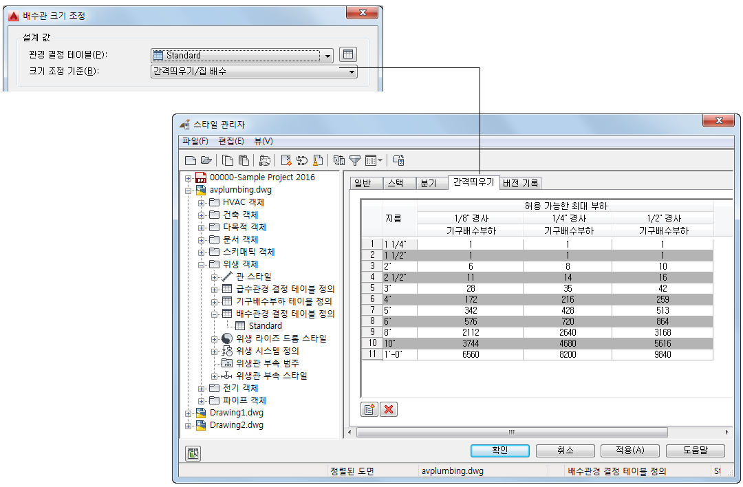 배수 런을 간격띄우기나 집 배수로 정의하면 위생 모듈에서 배수관경 결정 테이블(관경 결정 테이블)의 간격띄우기 탭에 있는 정보를 사용하여 크기 조정 계산을 수행합니다. 이 배수관경 결정 테이블의 정의는 스타일 관리자에서 확인할 수 있습니다.
