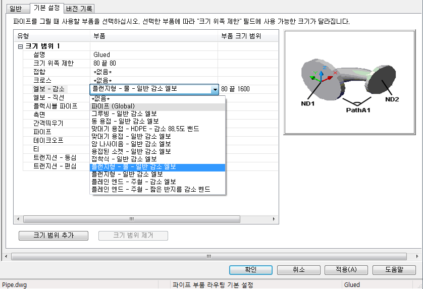 파이프 부품 라우팅 기본 설정