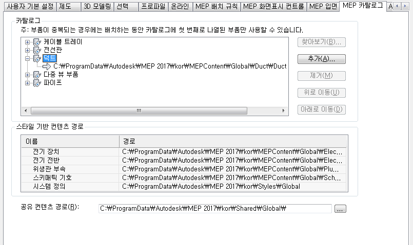 옵션 대화상자에서 배치 중에 사용할 컨텐츠(부품 카탈로그 및 스타일 기반 컨텐츠)의 위치를 지정합니다. 컨텐츠를 컴퓨터에 저장한 경우에는 해당 대화상자에서 로컬 위치를 지정합니다. 여러 사용자가 공유하기 때문에 네트워크에 컨텐츠를 저장한 경우에는 네트워크 위치를 지정합니다.