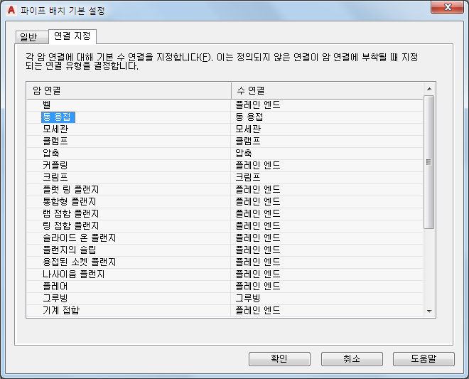 - 파이프 배치 기본 설정 대화상자에서 연결 지정 탭을 클릭합니다.