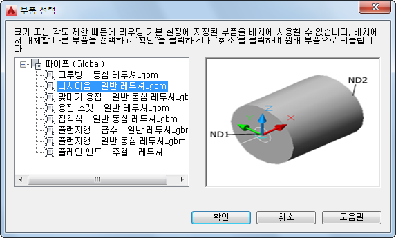 재료 유형별로 구성된 파이프 부품을 보여 주는 부품 선택 대화상자