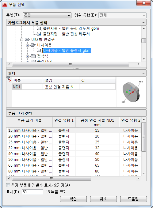 - 부품 선택 대화상자에서 카탈로그의 부품을 선택합니다.